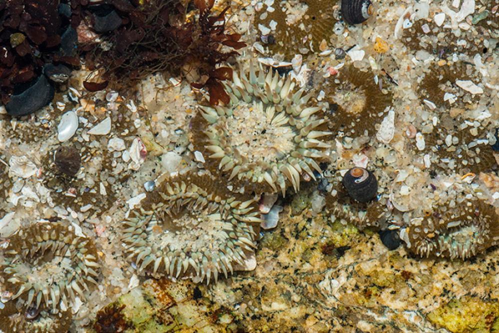 A small (5–10 cm/2–4 in in diameter) species of greenish-yellow anemone that groups together, or “aggregates.” You can see small pieces of rock and shell stuck to their olive exteriors when they close to prevent water loss.