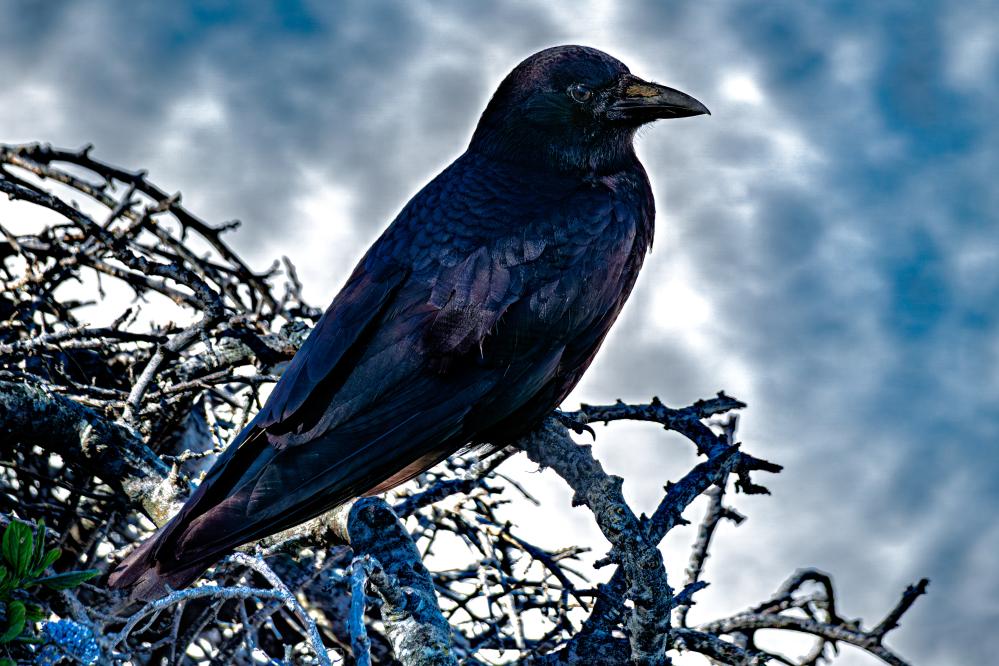 So familiar to us all, this large, black, large beaked bird that is so very smart. Glossy plumage and with a distinctive CAW that alerts us of its presence. Flies with a distinctive rowing motion.
